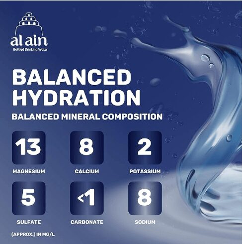 CHOOSE QUALITY, CHOOSE AL AIN: A balanced mineral composition to revitalize and nourish your body. Al Ain water contains the perfect balance of essential minerals, providing a uniquely soft and smooth taste.