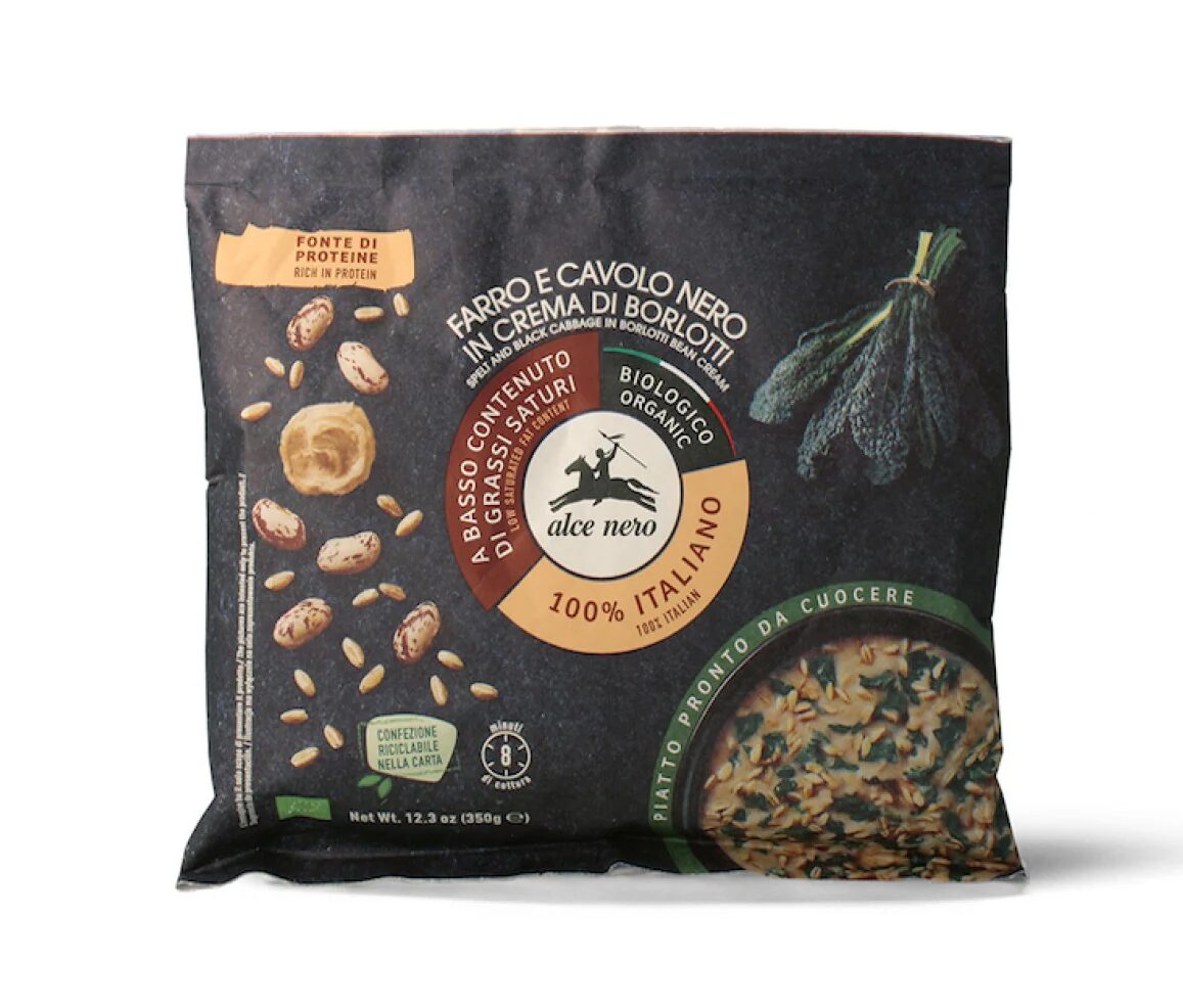 Preparation with borlotti beans (60%) (borlotti beans (80%) equal to 48% in the finished product, potatoes, type 0 soft wheat flour, salt), pearled spelled wheat 25%, black cabbage 15 %. Biological.