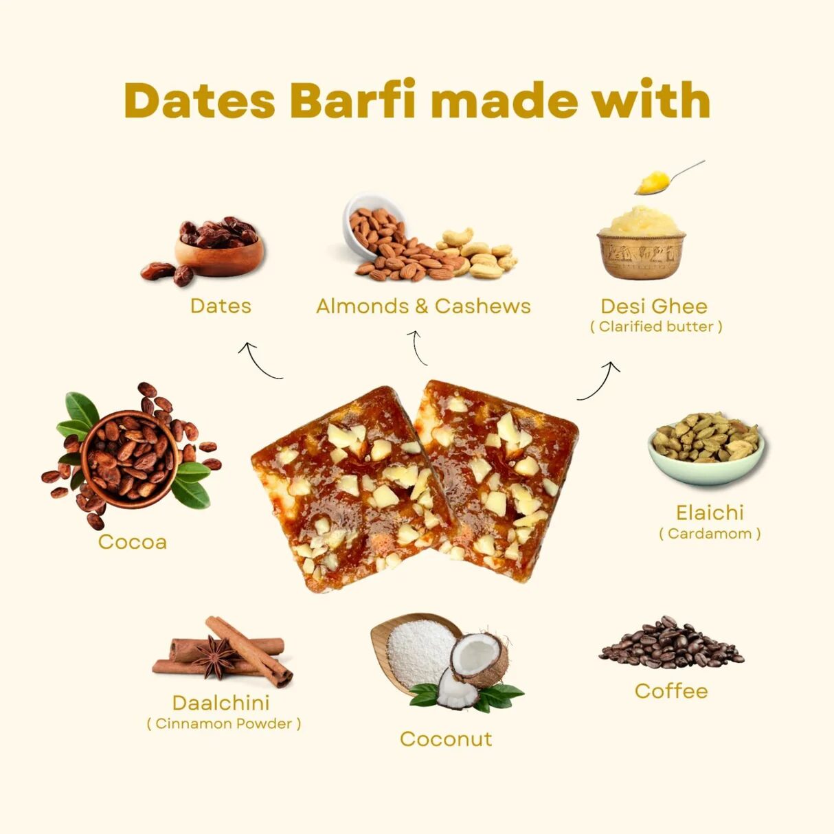 Dates, Cardamom, Cinnamon, Coconut, Coffee, Chocolate, Cocoa, Ghee