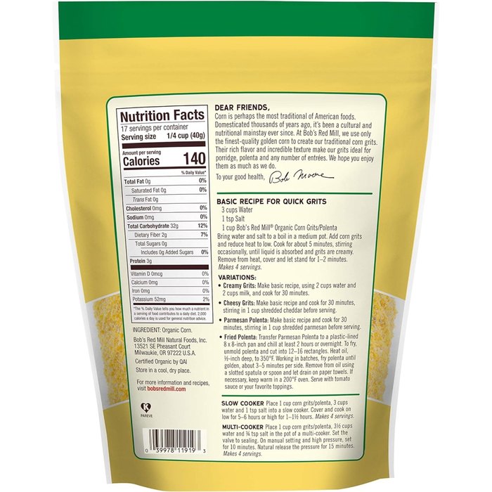 Bob’s Red Mill, Yellow Corn Grits, Organic, 24 oz is made using only the finest golden corn for a rich flavor that is sure to please your palate, any meal of the day. It is the imperative ingredient of the Italian dish, polenta. Similar to pasta, cooked polenta is delicious topped with marinara sauce, shredded cheese, or grilled or roasted vegetables.