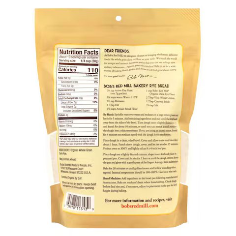 Bob’s Red Mill Organic Dark Rye Flour is a premium, whole-grain flour made from 100% stone-ground organic rye. Rich in flavor and nutrients, it’s perfect for baking hearty rye bread, crackers, and other rustic baked goods. Packed with fiber, protein, and essential nutrients, this flour adds depth and complexity to both traditional and modern recipes. Non-GMO and certified organic, it’s an excellent choice for health-conscious bakers seeking high-quality ingredients. Elevate your baking with the wholesome goodness of this versatile and flavorful flour.