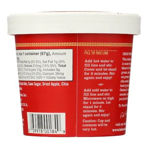 Bob’s Red Mill Organic Gluten Free Oatmeal Cup – Apple Cinnamon with Flax & Chia – 67g