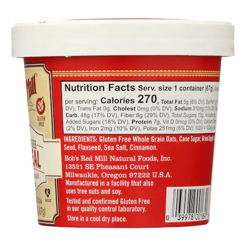 Bob’s Red Mill Gluten Free Oatmeal Apple and Cinnamon is a delicious and healthy breakfast option for those following a gluten-free diet. Each 67g packet contains a blend of gluten-free oats dried apple pieces and warm cinnamon creating a flavorful and comforting meal. This oatmeal is easy to prepare by simply adding hot water and allowing it to steep for a few minutes. It is also high in fiber and protein making it a satisfying way to start the day. This product is perfect for individuals with gluten intolerances or anyone looking to add variety to their breakfast routine.