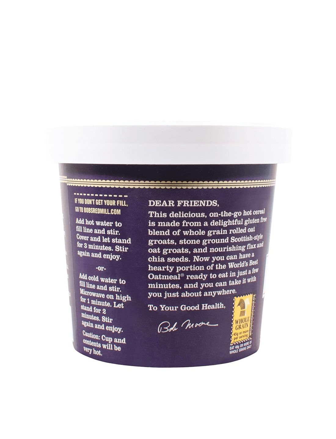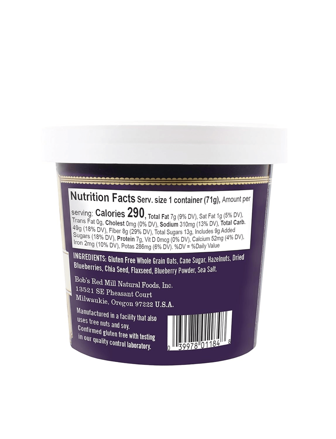 Enjoy hearty, homemade oats in half the time with Bob’s Red Mill’s Blueberry Hazelnut Oatmeal Cup. This portable whole grain breakfast is made with a blend of gluten free whole grain oats, premium Pacific Northwest hazelnuts, real blueberries, and flax and chia seeds. No bowl required: enjoy at home or at the office, school or out on the trail. Ready in just three minutes: just add hot water or heat in the microwave