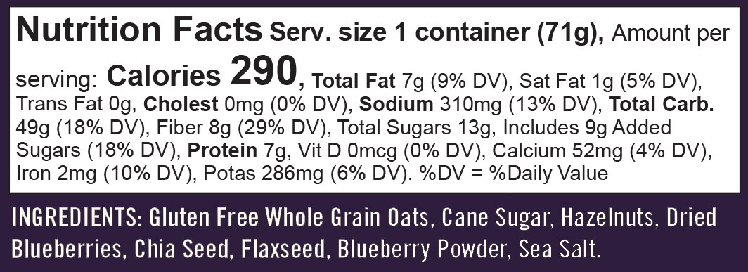 Gluten free Whole grain oats, cane sugar, hazelnuts, dried blueberries, chia seed, flaxseed, blueberry powder, sea salt.