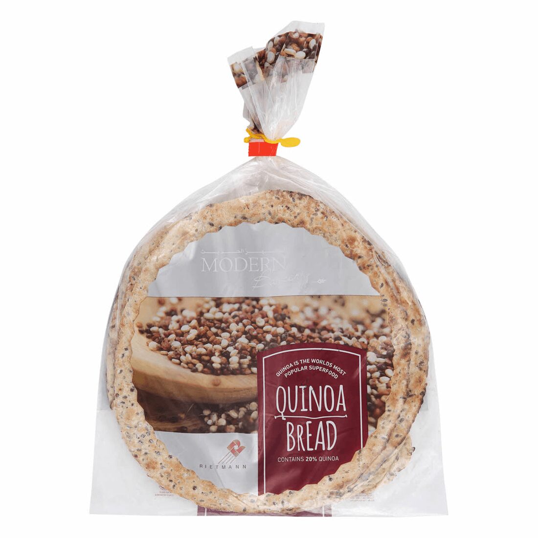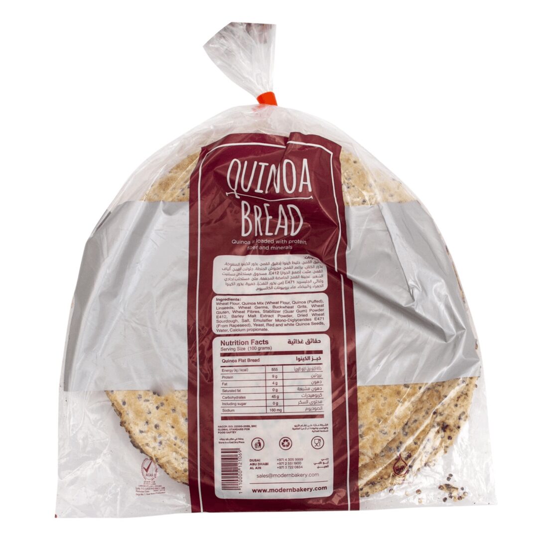 Wheat Flour, Quinoa Mix (Wheat Flour, Quinoa (Puffed), Linseeds, Wheat Germs, Buckwheat Grits, Wheat Gluten, Wheat Fibres, Stabilizer (Guar Gum) Powder E412, Barley Malt Extract Powder, Dried Wheat Sourdough, Salt, Emulsifier Mono-Diglycerides E471 (From Rapeseed), Flour treatment agent Ascorbic acid (E300, )Yeast, Red and White Quinoa Seeds, Water, Calcium Propionate (E282).