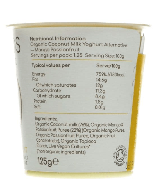 Coconut Milk* (76%), Mango & Passionfruit Puree* (22%) ( Mango Puree*, Passionfruit Puree*, Fruit Concentrate*), Tapioca Starch*, Live Vegan Culture.