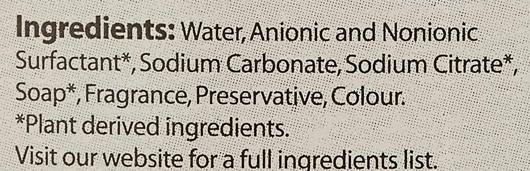 Water - Purified Solvent, Coco-Glucoside * Cleaning agent, Sodium Coco-Sulfate* Cleaning agent, Sodium Carbonate Builder, Sodium Citrate* Builder, Sodium Oleate* Foam Control, Ethanol* Viscosity control, Sodium Bicarbonate Builder, Citric Acid* pH adjuster, Fragrance Perfume, Benzisothiazolinone Preservative, CI 61585 Dye, *plant derived ingredients