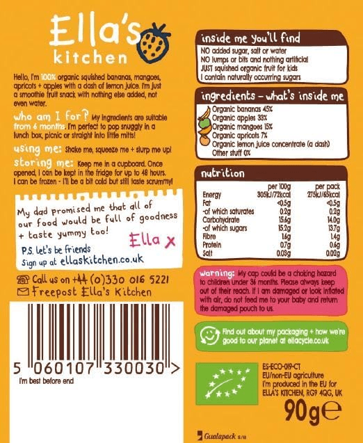 100% bananas, mangoes, apricots + apples with a dash of lemon juice. Just an organic Smoothie Fruit snack, with nothing else added, not even water. It contains 1 of the 5 lovely pieces of fruit and veg recommended each day!