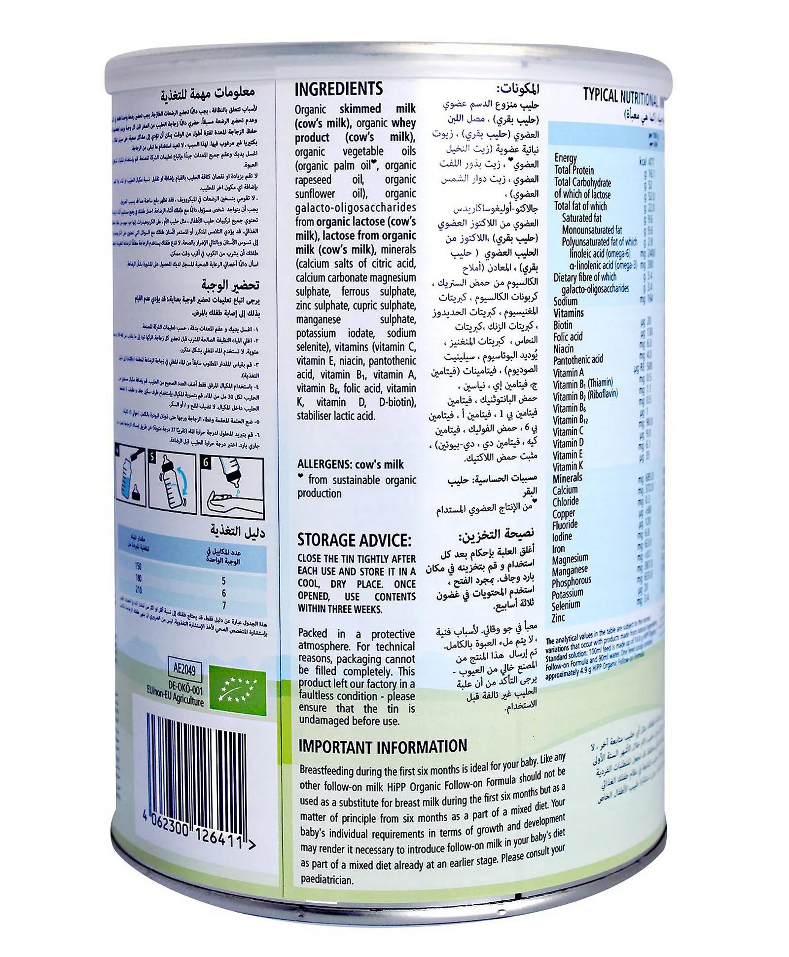 Organic Skimmed Milk, Organic Vegetable Oils (Palm Oil, Rapeseed Oil, Sunflower Oil), Organic Lactose, Organic Whey Protein (Partially Demineralised), Fibre (Galacto-oligosaccharides From Lactose), Calcium Carbonate, Emulsifier: Soya Lecithin, Vitamins (Vitamin C, Niacin, Vitamin E, Pantothenic Acid, Vitamin A, Thiamin (Vitamin B1), Vitamin B6, Riboflavin (Vitamin B2), Folic Acid, Vitamin K, Vitamin D, Biotin, Vitamin B12), Ferrous Sulphate, Potassium Chloride, Sodium Chloride, L-tryptophan, Zinc Sulphate, Magnesium Carbonate, Copper Sulphate, Potassium Iodide, Manganese Sulphate and Sodium Selenite.