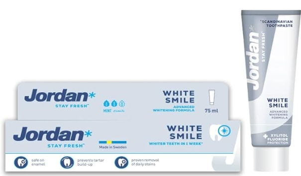 Jordan Stay Fresh White Smile Toothpaste 75ml, Removes Daily Stains Like Coffee and Tea, with Zinc & Xylitol,Whitening Effect, Gentle on Enamel, Developed and Produced in Scandinavia