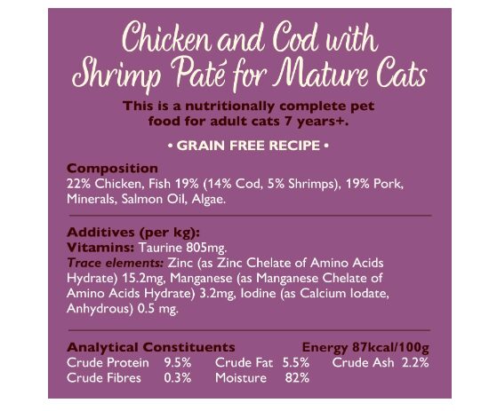 Proper and balanced recipe with a high meat content of tasty cuts of freshly prepared chicken and responsibly sourced cod & shrimp, sources of protein which develops muscle mass and sustains beautiful skin and coat
