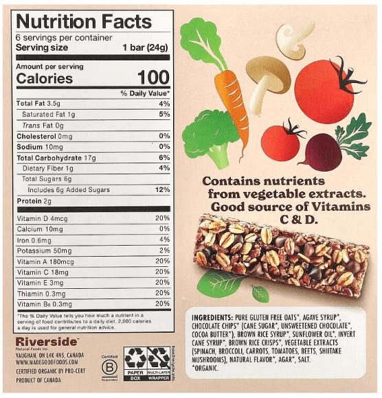 Pure Gluten Free Oats*, Agave Syrup*, Chocolate Chips* (Cane Sugar*, Unsweetened Chocolate*, Cocoa Butter*), Brown Rice Syrup*, Sunflower Oil*, Invert Cane Syrup*, Brown Rice Crisps*, Vegetable Extracts (Spinach, Broccoli, Carrots, Tomatoes, Beets, Shiitake Mushrooms), Natural Flavor*, Agar*, Salt. *Organic