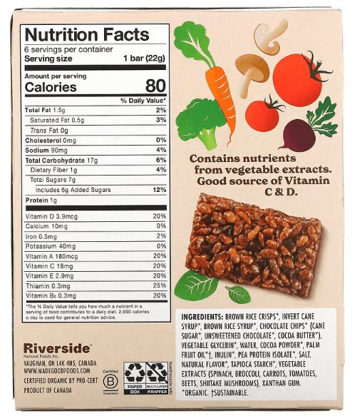 Rice Crisps* (Rice*, Dried Cane Syrup*, Salt, Brown Rice Syrup*), Sugars* (Invert Cane Syrup*, Brown Rice Syrup*), Chocolate Chips* (Cane Sugar*, Unsweetened Chocolate*, Cocoa Butter*), Vegetable Glycerin*, Water, Palm Fruit Oil*†, Cocoa Powder*, Rice Protein*, Inulin*, Natural Flavor*, Tapioca Starch*, Sea Salt, Vegetable Extracts (Broccoli, Spinach, Shiitake Mushroom, Beet), Xanthan Gum. *Organic. †Sustainable.