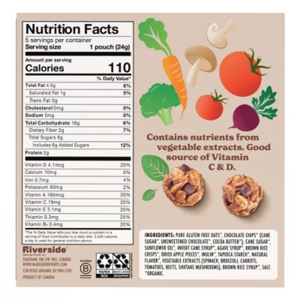 Pure Gluten Free Oats*, Sugars* (Cane Sugar*, Invert Cane Syrup*, Agave Syrup*, Brown Rice Syrup*), Chocolate Chips* (Cane Sugar*, Unsweetened Chocolate*, Cocoa Butter*), Sunflower Oil*, Brown Rice Crisps*, Dried Apple Pieces*, Inulin*, Tapioca Starch*, Natural Flavour*, Vegetable Extracts (Spinach, Broccoli, Carrots, Tomatoes, Beets, Shiitake Mushrooms), Salt. *Organic