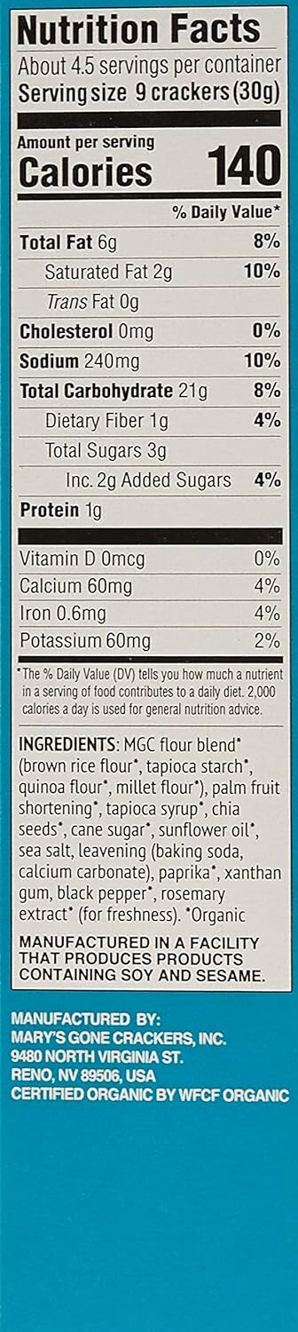 MGC flour blend* (brown rice flour*, tapioca starch*, quinoa flower*, millet flour*), palm fruit shortening*, tapioca syrup*, chia seeds*, cane sugar*, sunflower oil*, sea salt*, leavening (baking soda, calcium carbonate), paprika*, xanthan gum, black pepper*, rosemary extract* (for freshness). *Organic.