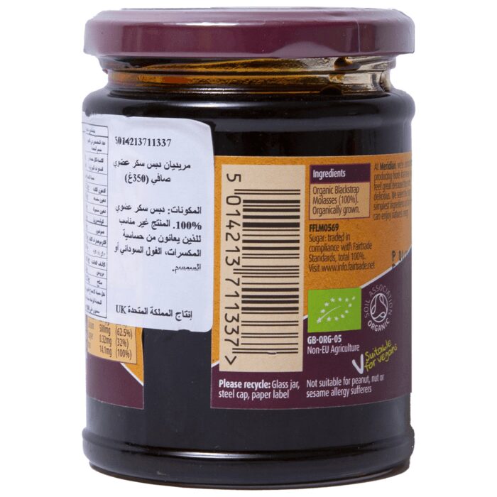 The Meridian Organic Fairtrade Molasses is suitable for a vegan diet. The organic blackstrap molasses is a by-product obtained by refining traditional sugarcane.