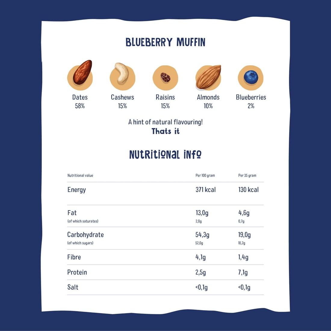 Dates 58%, Cashews 15%, Raisins 15%, Almonds 10%, Blueberries 2%, A hint of Natural Flavouring