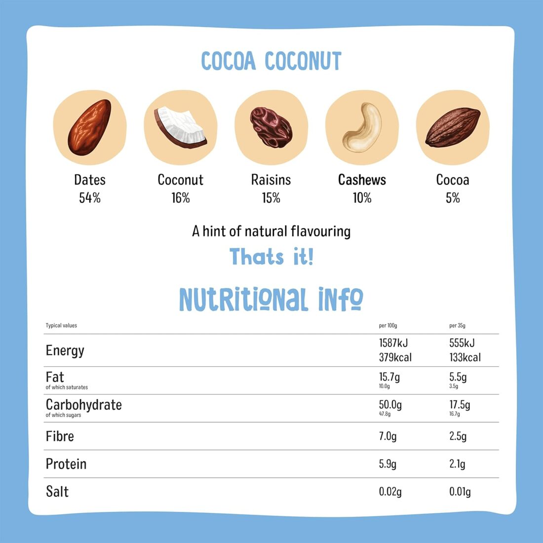 Dates(54%), Coconut(16%), Raisins(15%), Cashews(10%), Cocoa(5%), Natural flavouring