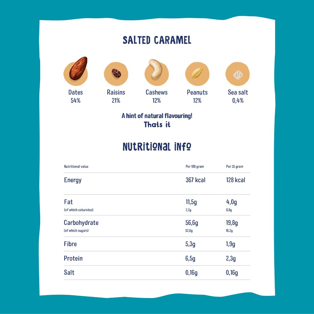 Dates 54%, Raisins 21%, Cashews 12%, Peanuts 12%, Sea Salt 0.4%, A hint of Natural Flavourings