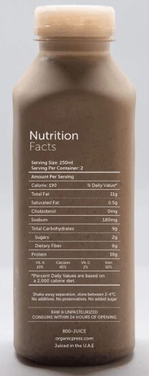 Almond, Dates, Banana, Almond Butter, Plant Protein, Cacao, Vanilla, Sea Salt, Chia Seeds.