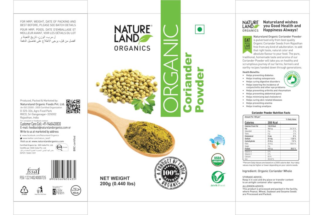 Organic organic coriander powder 100 gm natureland, a versatile culinary spice.