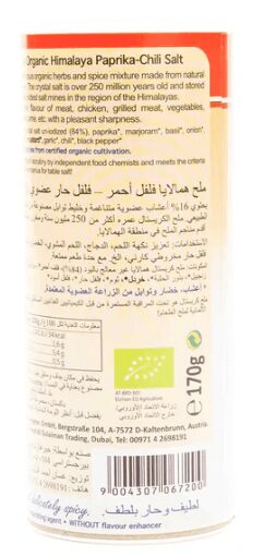Himalayan Crystal salt (non-iodized), paprika, marjarom, basil, onion, ginger, mustard, chili, black pepper