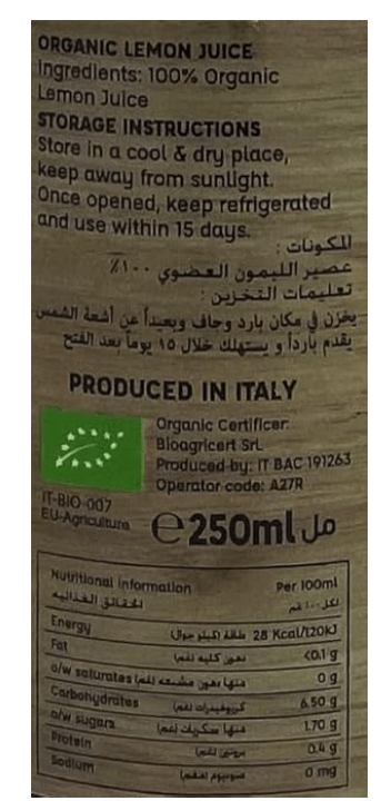 Organic Larder 100% Lemon Juice 250ml. Produced in Italy. Once opened, keep refrigerated and use within 15 days. This product will be an excellent pick for you. It comes in good packaging.