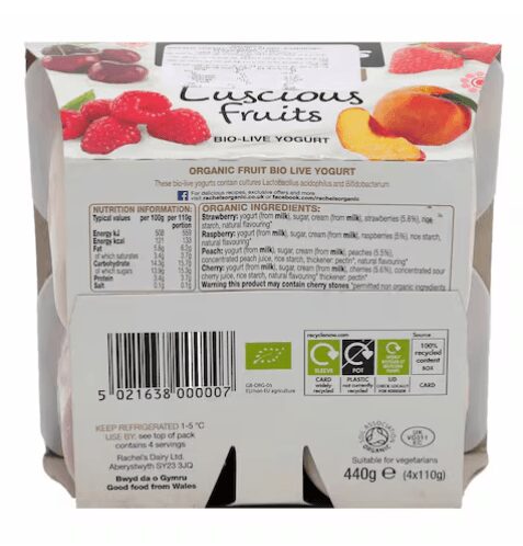 Rachel’s Organic Luscious Cherry, Raspberry, Strawberry & Peach Fruits is a multipack of sumptuously creamy and fruity yogurts. Delicious to be eaten on its own or with fruit or cereal. Our pots are now recyclable!