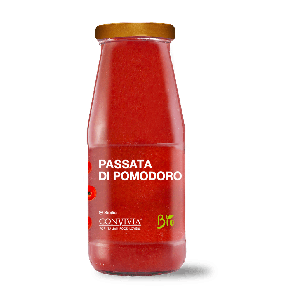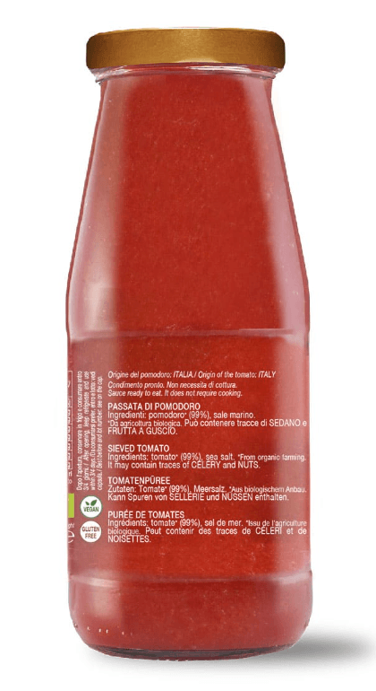 The Organic Tomato Puree is a product of the highest quality: made with ripe and hand-selected tomatoes, grown without the use of pesticides and chemicals. The processing takes place at low temperatures to best preserve the flavor and organoleptic properties of the tomatoes. The result is a tomato puree with an intense and genuine taste, which represents the perfect combination of the tradition of Italian cuisine and attention to health and the environment. Perfect for preparing sauces, sauces and Mediterranean dishes, this Organic tomato puree is an excellent choice for those looking for a healthy, tasty and environmentally friendly product. the organic tomato puree is packaged in glass to ensure maximum freshness and preservation.