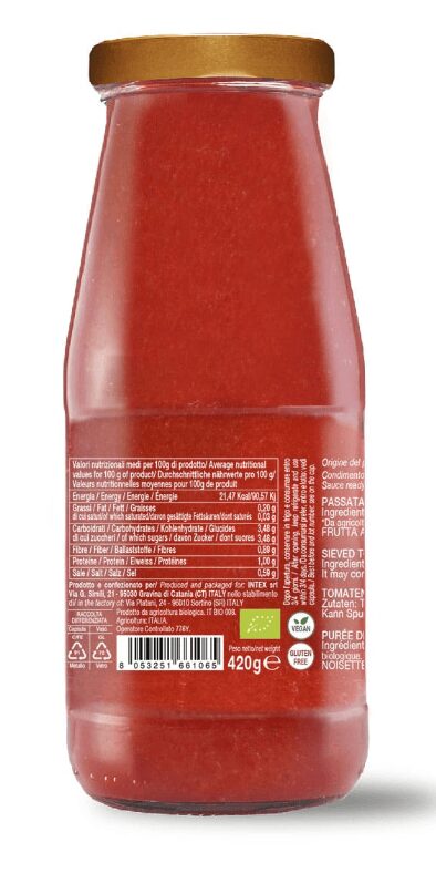 The Organic Tomato Puree is a product of the highest quality: made with ripe and hand-selected tomatoes, grown without the use of pesticides and chemicals. The processing takes place at low temperatures to best preserve the flavor and organoleptic properties of the tomatoes. The result is a tomato puree with an intense and genuine taste, which represents the perfect combination of the tradition of Italian cuisine and attention to health and the environment. Perfect for preparing sauces, sauces and Mediterranean dishes, this Organic tomato puree is an excellent choice for those looking for a healthy, tasty and environmentally friendly product. the organic tomato puree is packaged in glass to ensure maximum freshness and preservation.