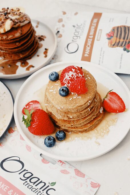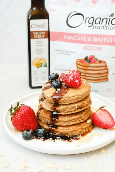 Organic Traditions Pancake & Waffle Mix makes delicious, wholesome breakfasts easy! Our pancakes are fluffy, subtly sweet, and nutrient dense. We’ve combined certified gluten free oat flour, prebiotic green banana flour and delicately sweet coconut flour for melt in your mouth pancakes. Our gluten free pancake mix can also be used to make crispy, scrumptious waffles! Add batter and follow instructions based on your waffle iron.