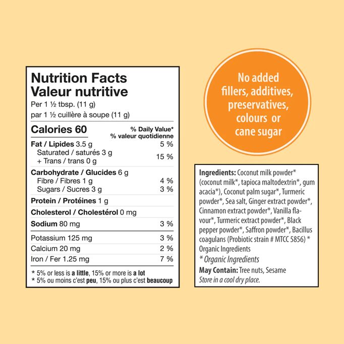 organic coconut milk powder, organic coconut palm sugar, organic turmeric powder, sea salt, organic ginger extract powder, organic cinnamon extract powder, bacillus coagulans (#MTCC 5856), organic turmeric extract powder, organic black pepper powder, organic vanilla flavour, organic saffron powder.
