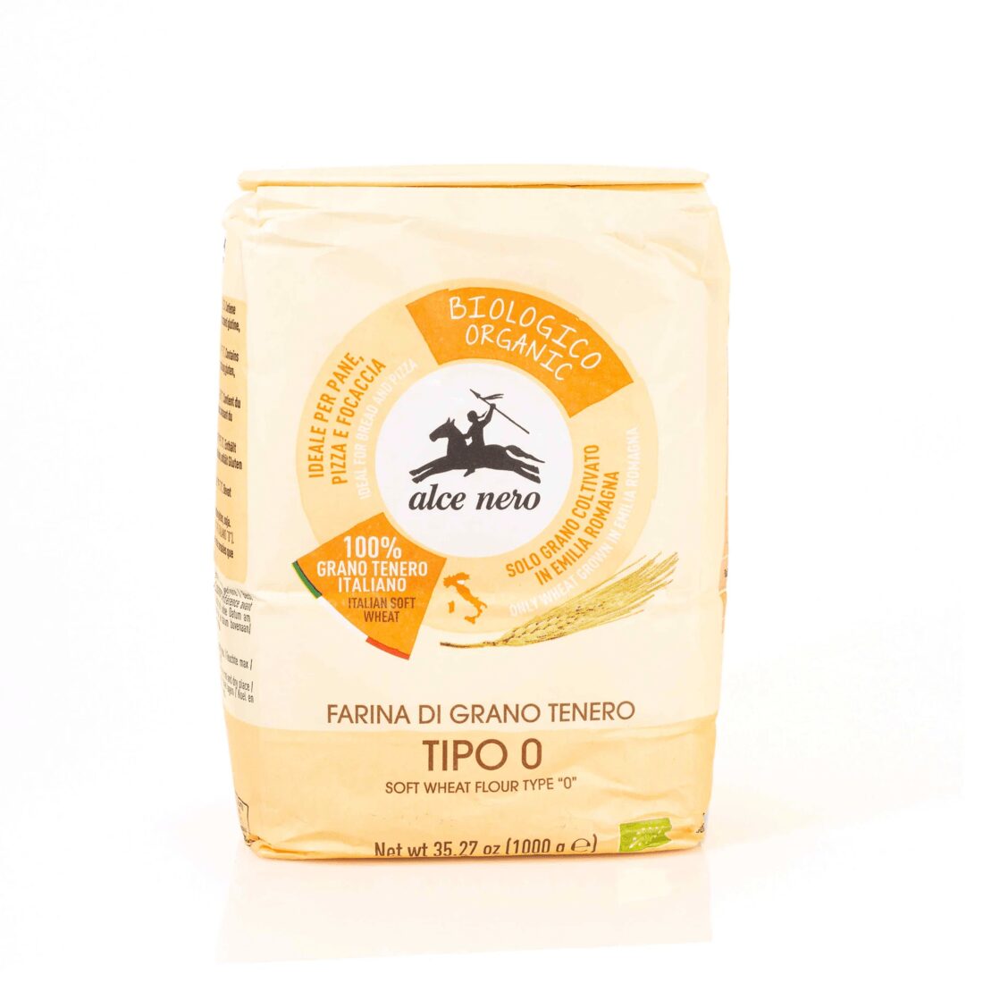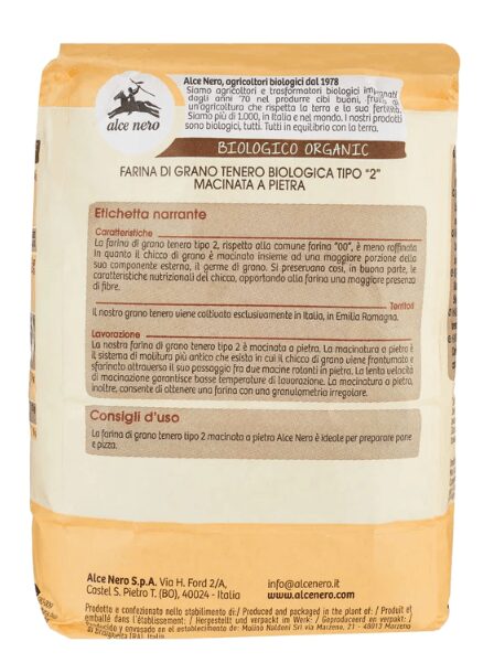 Alce Nero organic soft wheat flour type “0” is produced using only organic wheat grown in Italy of which the grain is ground, deprived only of the external parts. It is recommended for making bread, pizzas, focaccia and wraps.