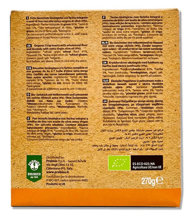Probios Wholemeal Rusks are made with 100% organic wholemeal flour. The recipe, free of added sugar, is enriched with extra virgin olive oil and offers a high amount of fiber, guaranteeing a genuine and balanced product. Thanks to a slow drying process of at least 20 hours, a perfect crunchy texture is achieved. Enjoy them for breakfast with jam or spreads, or combine them with savory ingredients for a nutritious and delicious snack. Discover all the other variants of the line: wholemeal spelt, white flour, wholemeal with flax seeds, with cereals, without salt and with kamut.