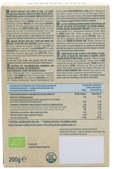 *Brown rice flour 19.7%, *sunflower oil, sweetener: *erythritol 13%, *whole OAT flour 9.8%, *chickpea flour, *corn starch, *HAZELNUT grains 3.9%, natural HAZELNUT flavor, *cinnamon, salt, flax fiber, raising agents: cream of tartar, baking soda. *biological.