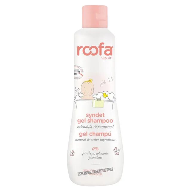 Roofa Spain syndet baby gel shampoo (without sulphates) is fragrance-free, enriched with panthenol and calendula. These natural ingredients help hydrate, soften and protect the skin and scalp from foreign agents. Syndet gel-shampoo contains ingredients that nourish while they clean. Roofa Baby syndet baby gel shampoo is specially formulated with a unique composition of natural spring water sourced from the French Atlantic Pyrenees Roofa syndet gel shampoo maintains the skin and scalp’s pH without irritating baby in any way. Sting-free formula. Made In Spain using ingredients selected with the utmost care for children’s sensitive skin.