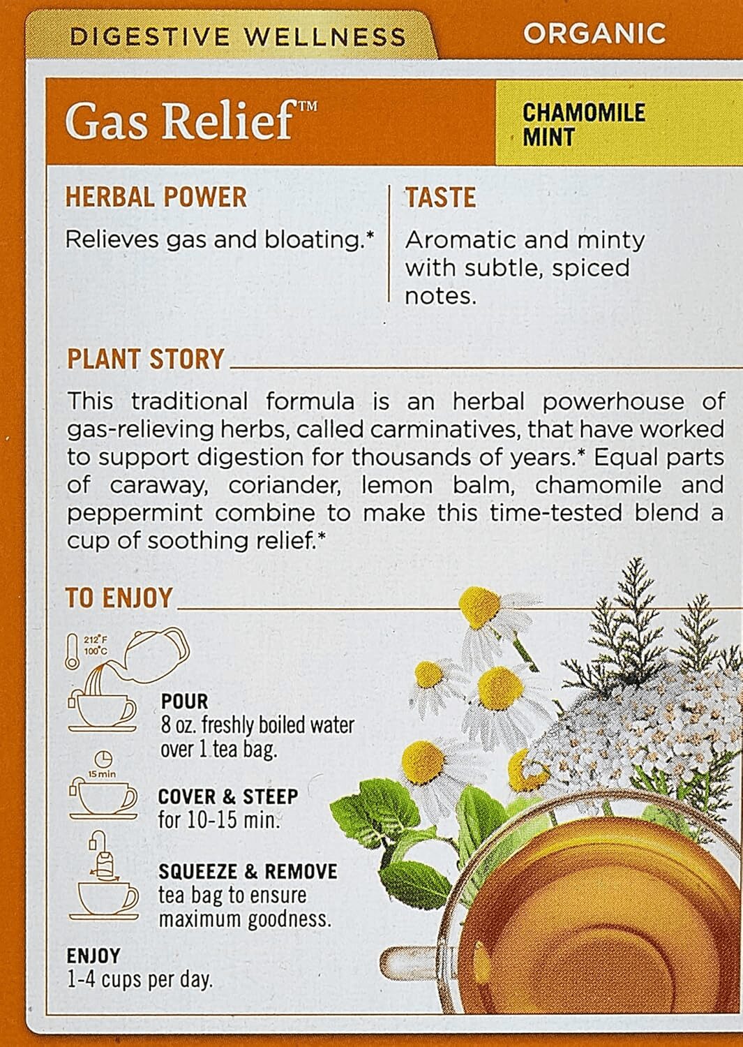 Equal parts of caraway, coriander, lemon balm, chamomile, and peppermint combine to make this time-tested, soothing tea that helps with bloating and provides natural gas relief.