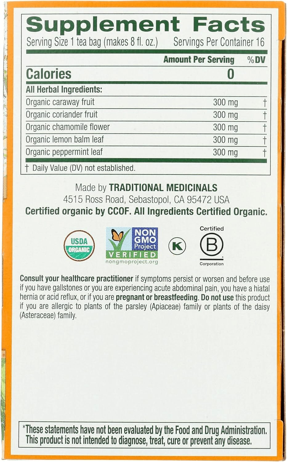 Organic caraway fruit, Orgaic coriander fruit, Organic chamomile flower, Organic lemon balm leaf, Organic peppermint leaf.