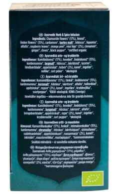 chamomile flowers*, fennel*, linden flowers*, cardamom*, barley malt*, hibiscus*, liquorice*, alfalfa*, raspberry leaves*, orange peel*, rose hips*, cinnamon*, ginger*, cloves*, black pepper*